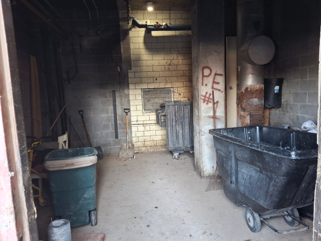 Before this chat, I mostly fixated on the use of a standard rolling dumpster for gathering garbage via the garbage chutes on the upper levels, the collection of irrelevant junk, the degree by which everything was deeply unsanitary, and how any points of entry from within the building are sealed off. The only way to enter this area was through outside doors.
