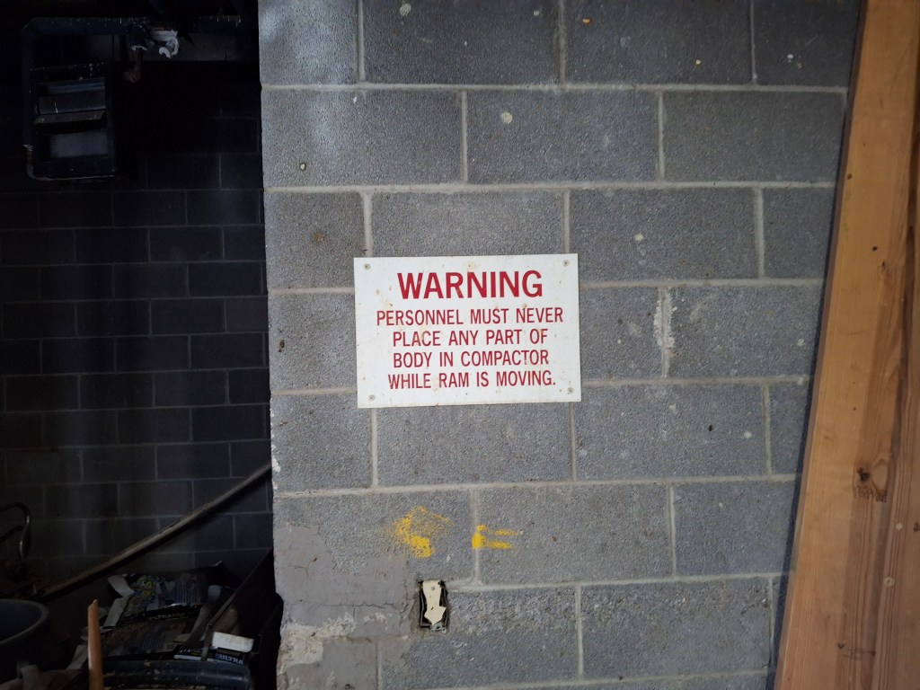 - Liability: Keeping a sign up that warns about “moving parts” for a machine that doesn’t exist is a minor point compared to the open electrical box below it. That’s a “fix-it-today” item regardless of the machinery.